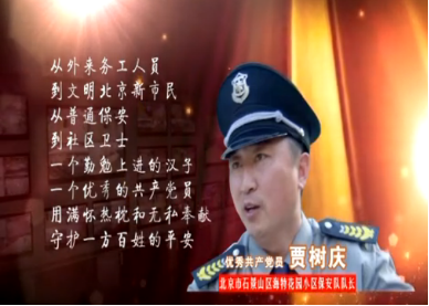 賈樹慶,山東安丘市人、本科學(xué)歷、黨員、系北京市保安服務(wù)總公司石景山分公司第三項(xiàng)目部經(jīng)理。1999年6月參加保安工作、先后榮立個人二等功2次、三等功4次、個人嘉獎10余次、石景山區(qū)“十佳進(jìn)京創(chuàng)業(yè)青年”、北京市“群眾心目中的好黨員”、首都“五一勞動獎?wù)?rdquo;、全國“五一勞動獎?wù)?rdquo;、“文明北京新市民”、“身邊雷鋒、最美北京人”、北京“萬名孝星”、全國“勞動模范”、“第四屆全國先進(jìn)保安員”等稱號。2011年,他作為石景山的代表之一,參加了北京市第十一次黨代會。10多年來,他帶領(lǐng)隊(duì)員們協(xié)助公安機(jī)關(guān)抓獲搶劫等各類違法犯罪嫌疑人65名,積極為社區(qū)做好事,為居民做好事8000余件,幫助居民解決困難600次、參與社區(qū)清理整頓2000多次,協(xié)助街道等部門處理各類不法事件10000多起,社區(qū)居民親切地稱他“平安社區(qū)保護(hù)神”。