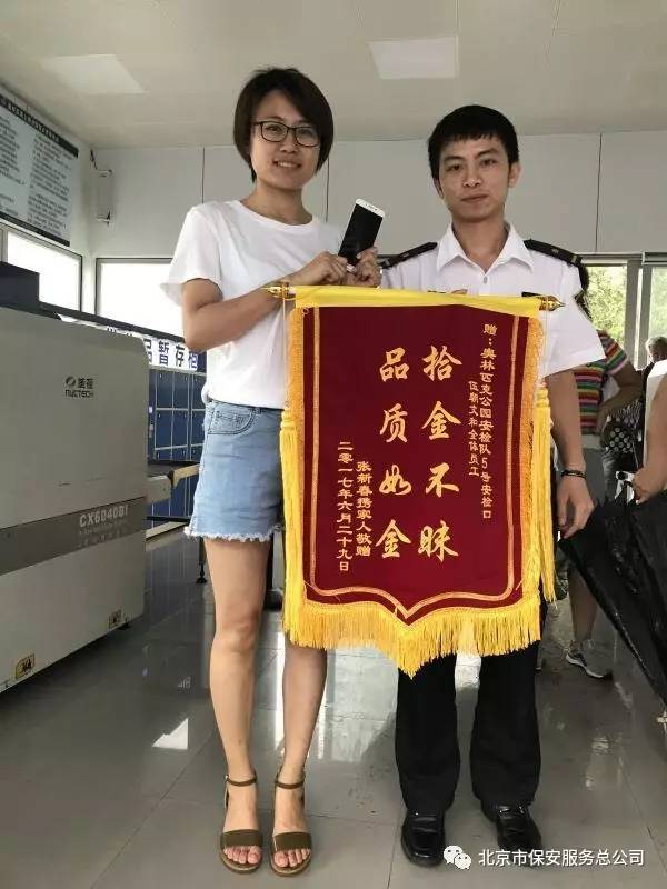 7月6日中午,家住河南的張新春專程乘火車來(lái)到北京奧林匹克公園5號(hào)安檢口,向全體安檢員隊(duì)員贈(zèng)送一面“拾金不昧 品質(zhì)如金”的錦旗,稱贊“你們是北京安檢員的榜樣”。