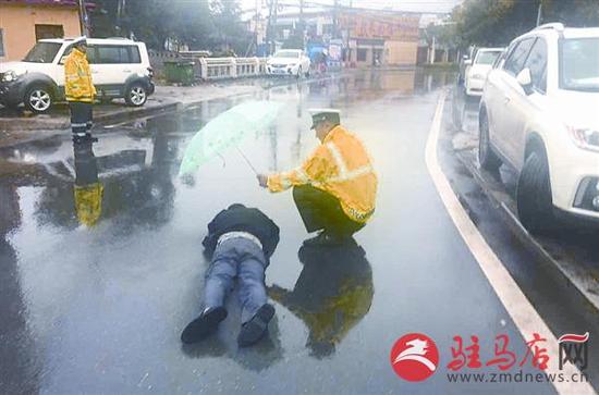 9月5日16時許,天空下著雨,在市雪松大道與駿馬路交叉口北側(cè),一男子醉酒后躺在馬路中間,來往車輛呼嘯而過,非常危險。為了醉酒男子的安全,輔警蹲在地上為其撐起雨傘。