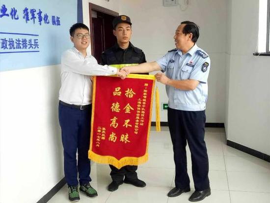 失主張先生給保安公司送去錦旗感謝馬立翔拾金不昧,中間人的是馬立翔。