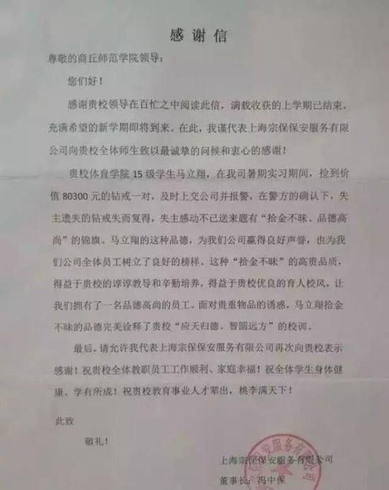 此事直到張先生的一面錦旗和一份感謝信由保安公司寄往馬立翔就讀的商丘師范學(xué)院,才被人所知,校友們稱(chēng)他“鉆石哥”。